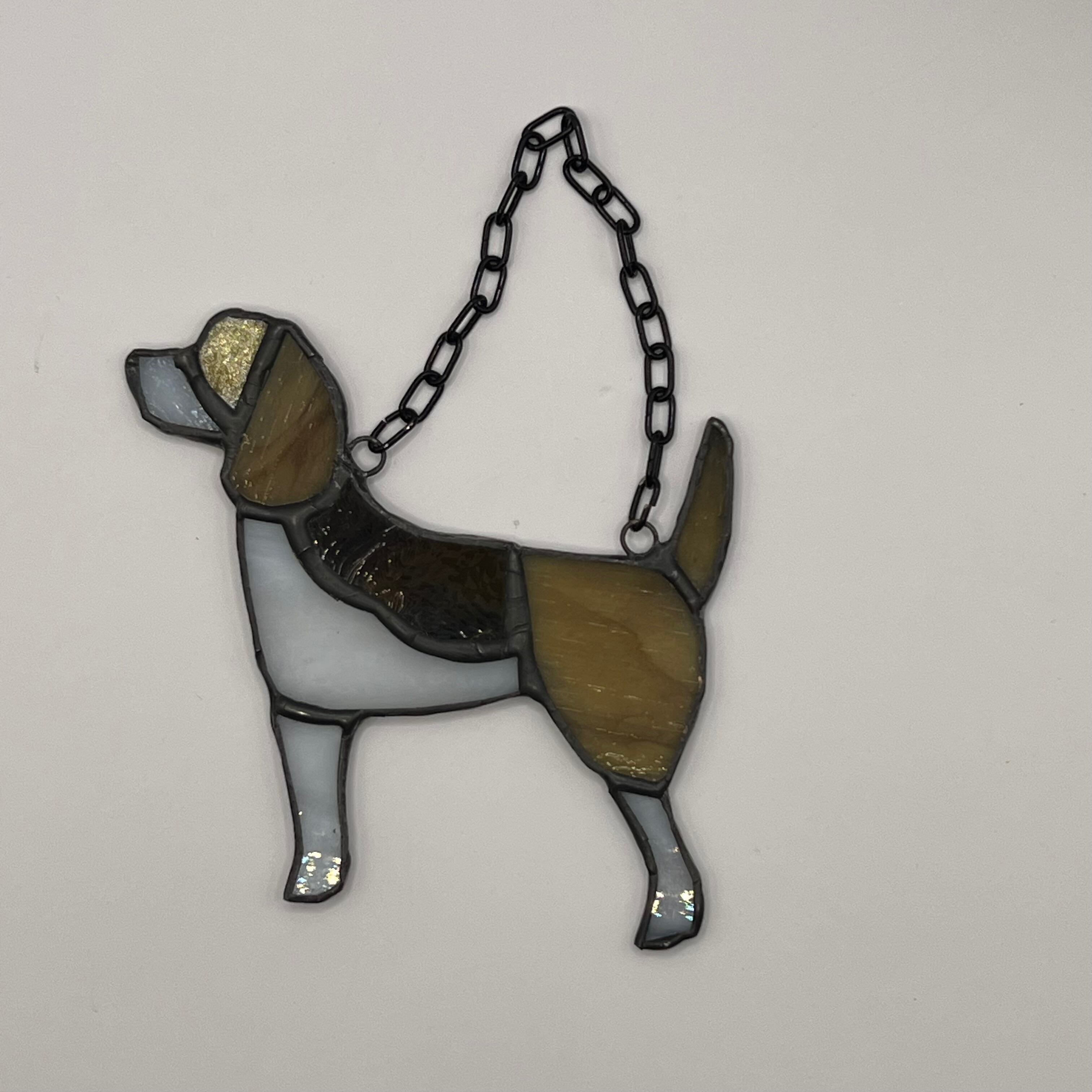 輸入ガラスを数種類使い、伝統的な技法で作成したビーグルのシルエットのステンドグラスです。
