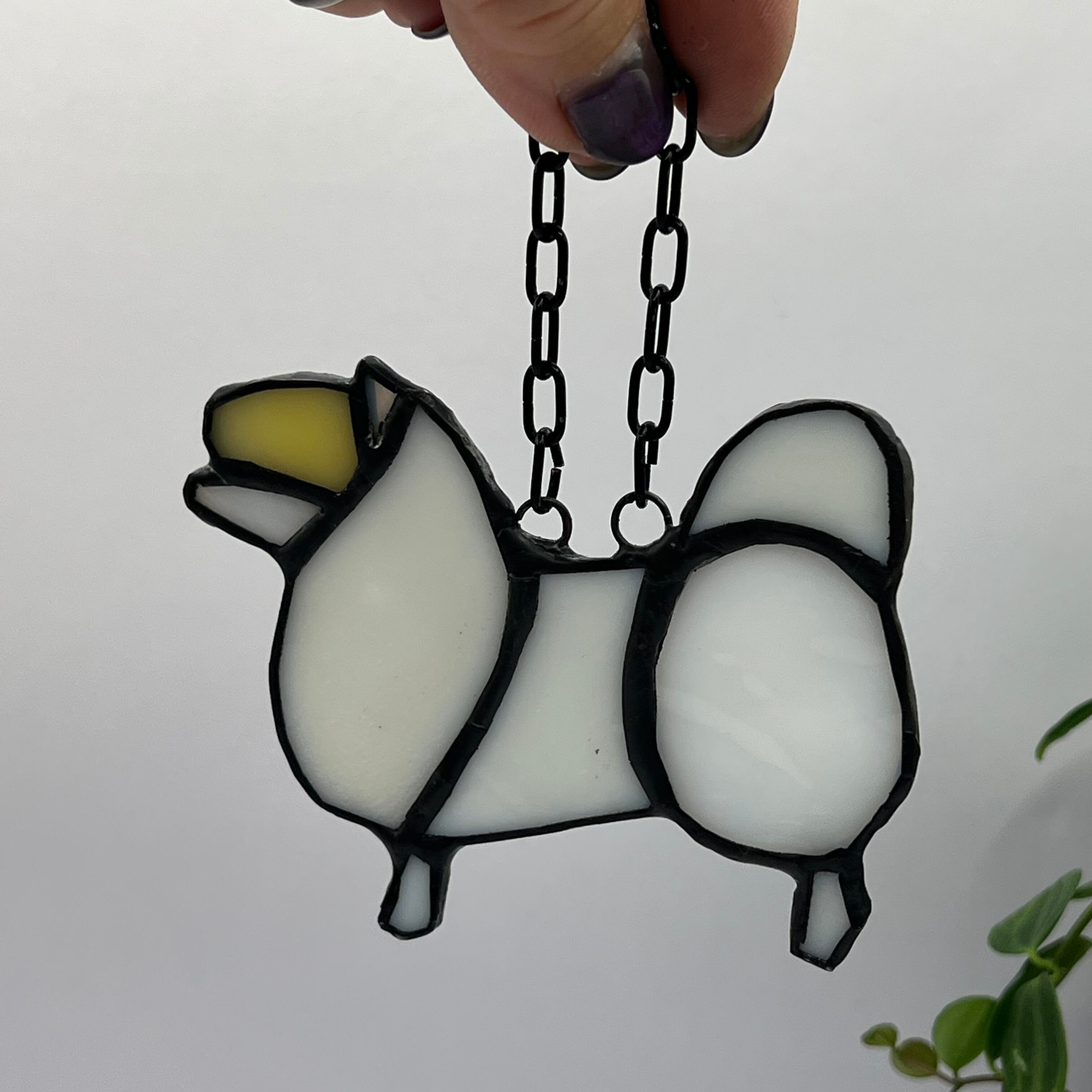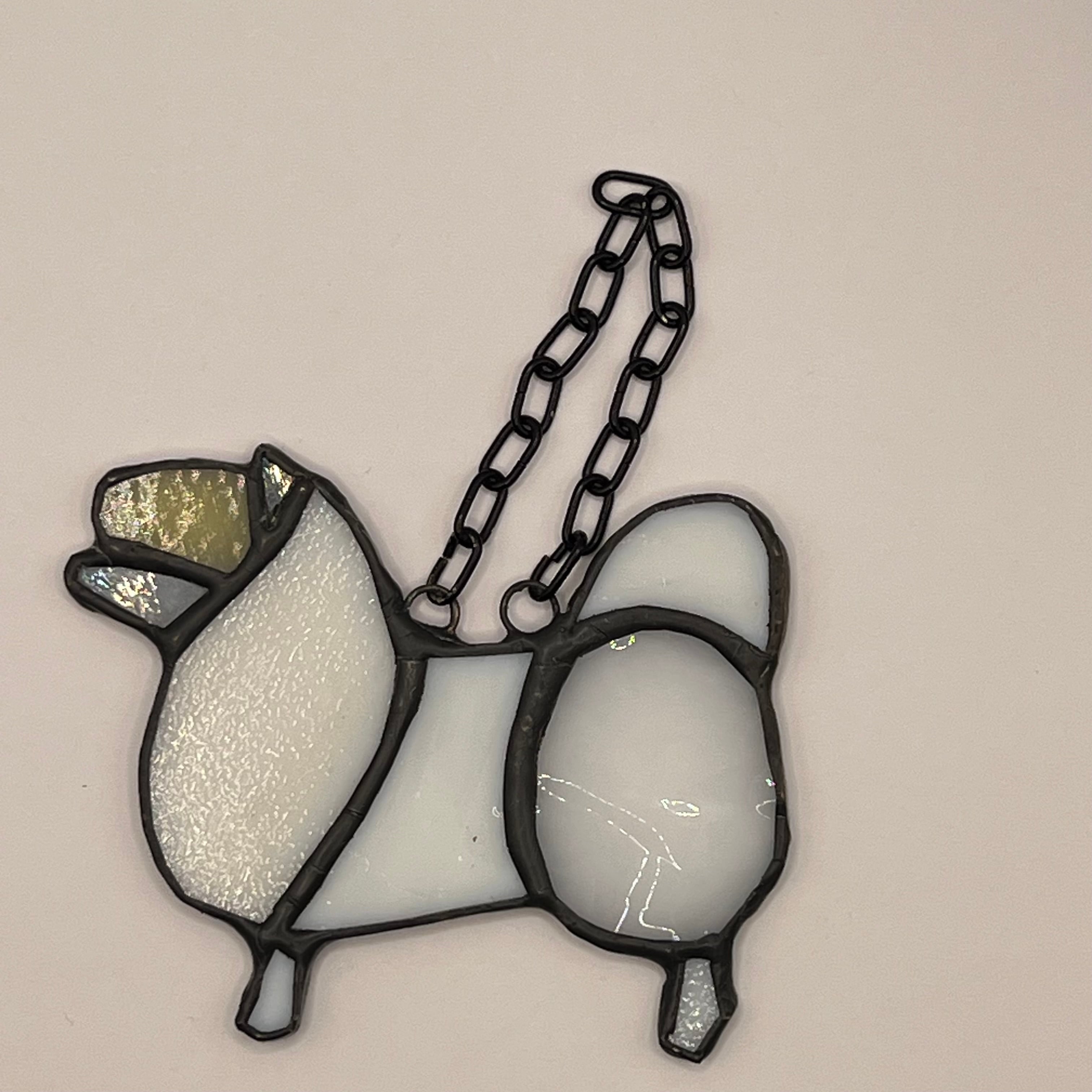 輸入ガラスを数種類使い、伝統的な技法で作成したポメラニアンのシルエットのステンドグラスです。